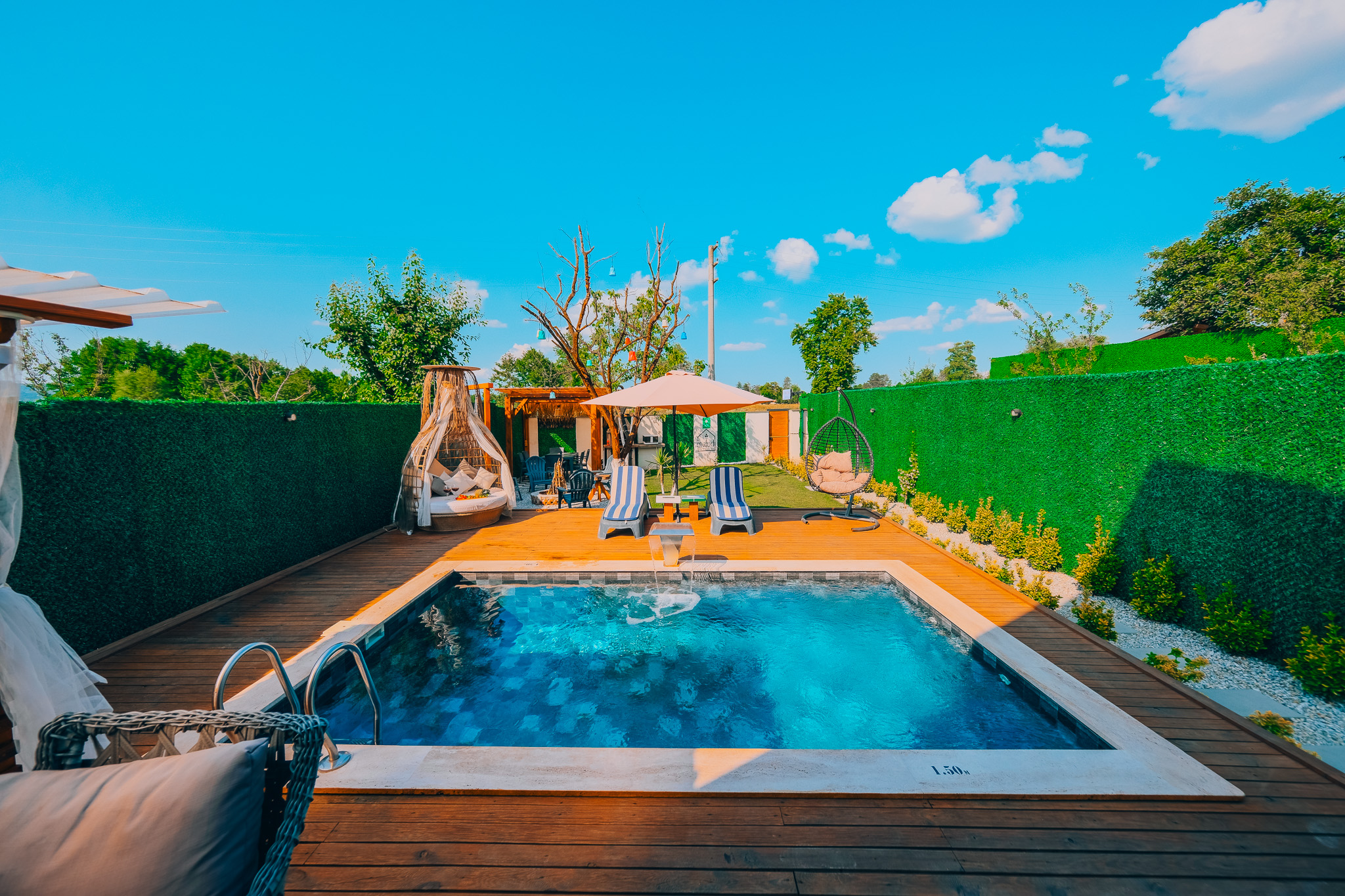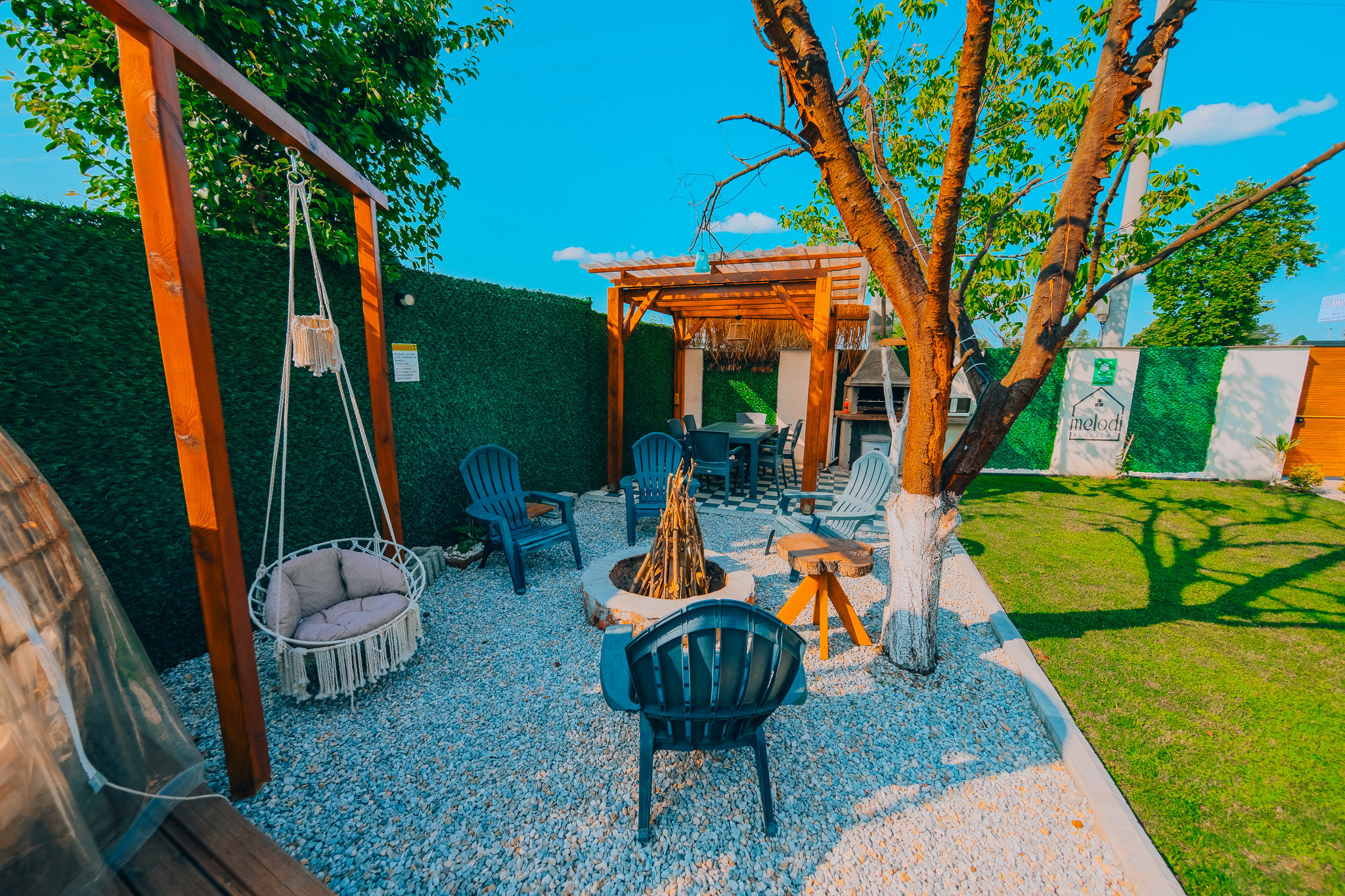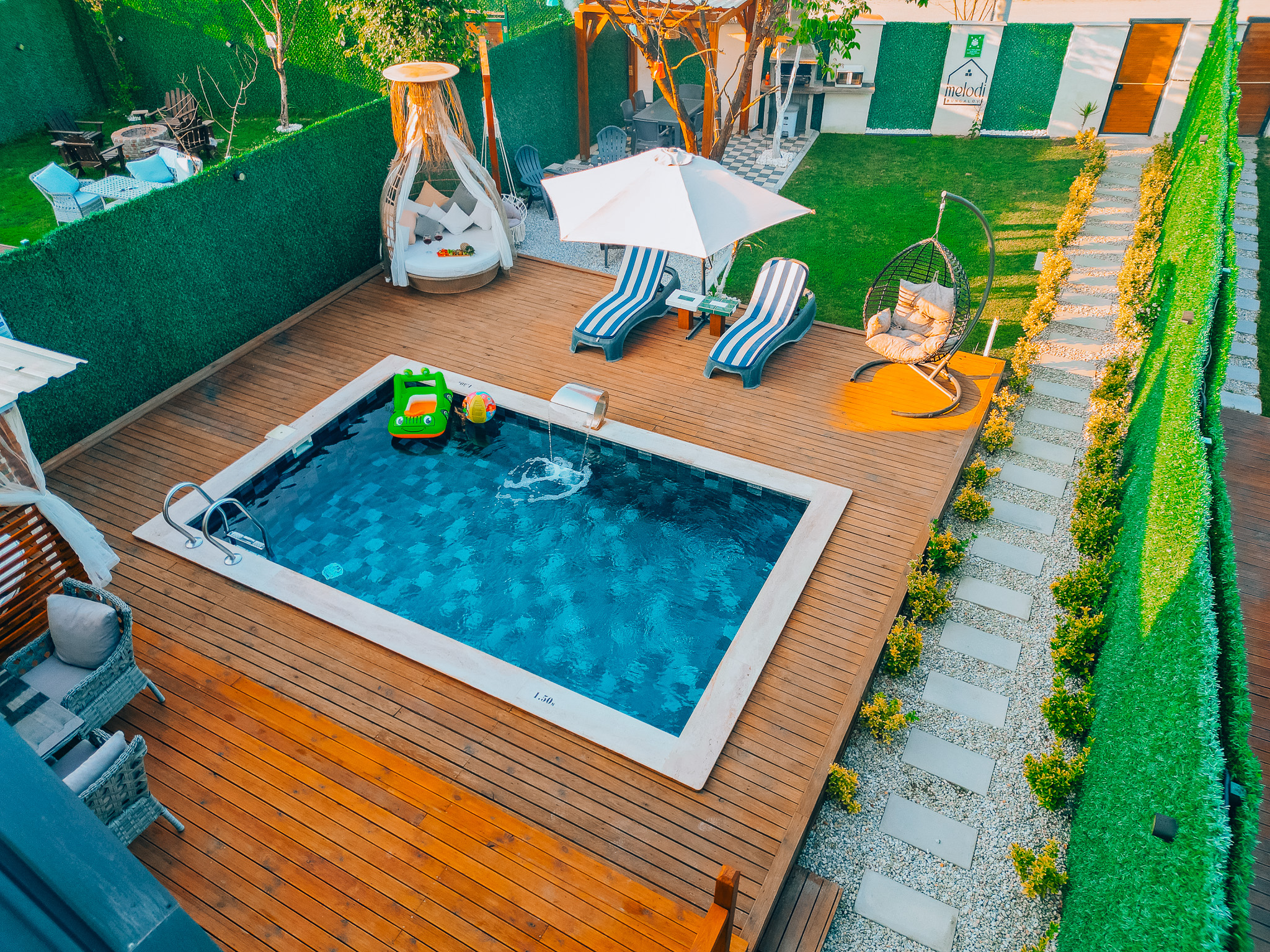 Bungalovlarımızın kendine ait yaklaşık 150 m² genişliğinde özel bir bahçesi bulunmaktadır. Bu alan misafirlerimize doğayla iç içe, huzurlu bir ortam sunarken, barbekü yapma için de uygundur.