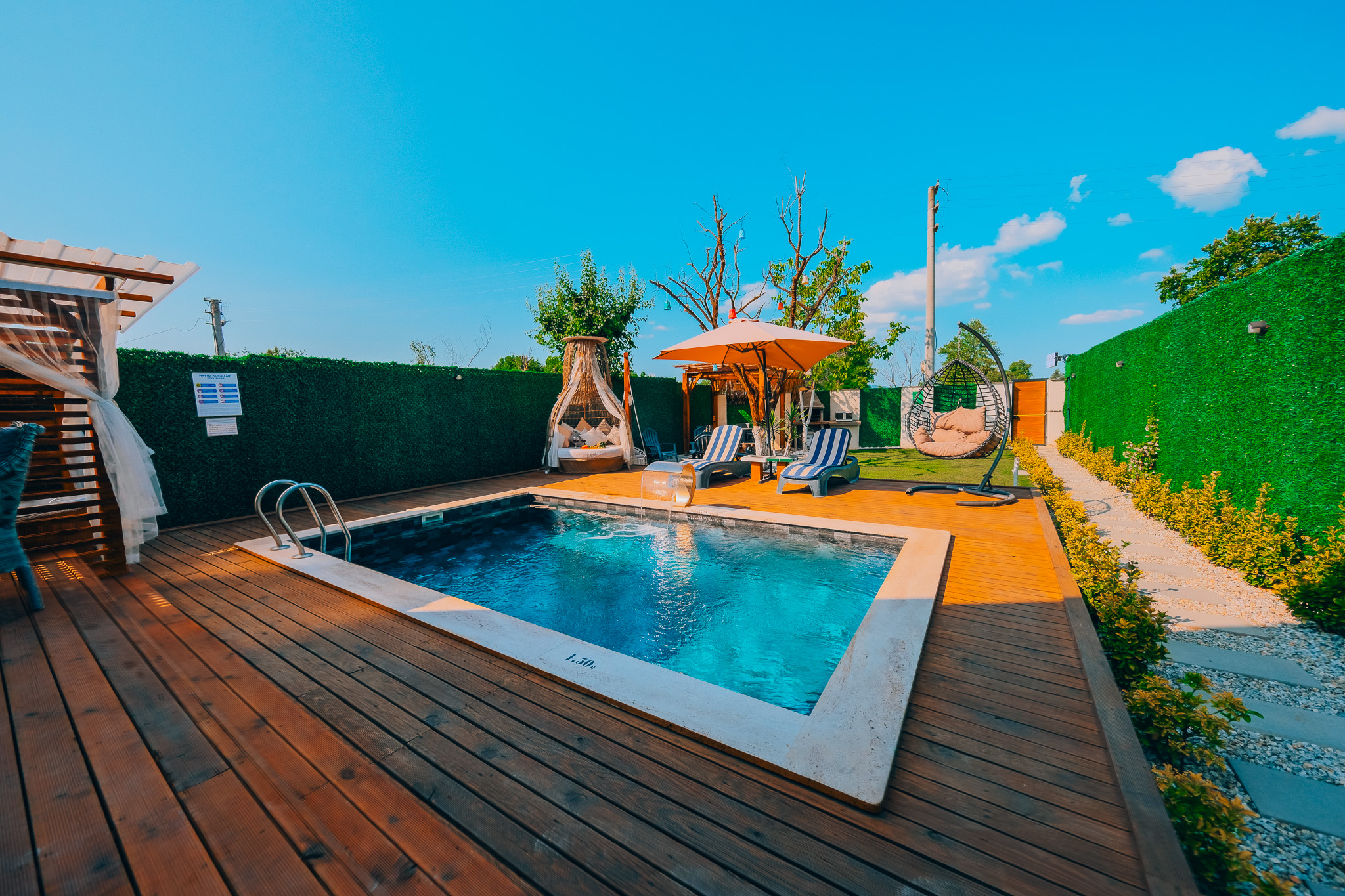 Havuzlarımız 3×5 metre boyutlarında ve ısıtmalıdır. Düzenli olarak bakım ve temizliği yapılmakta, klor ve ph seviyesi kontrol edilmektedir.